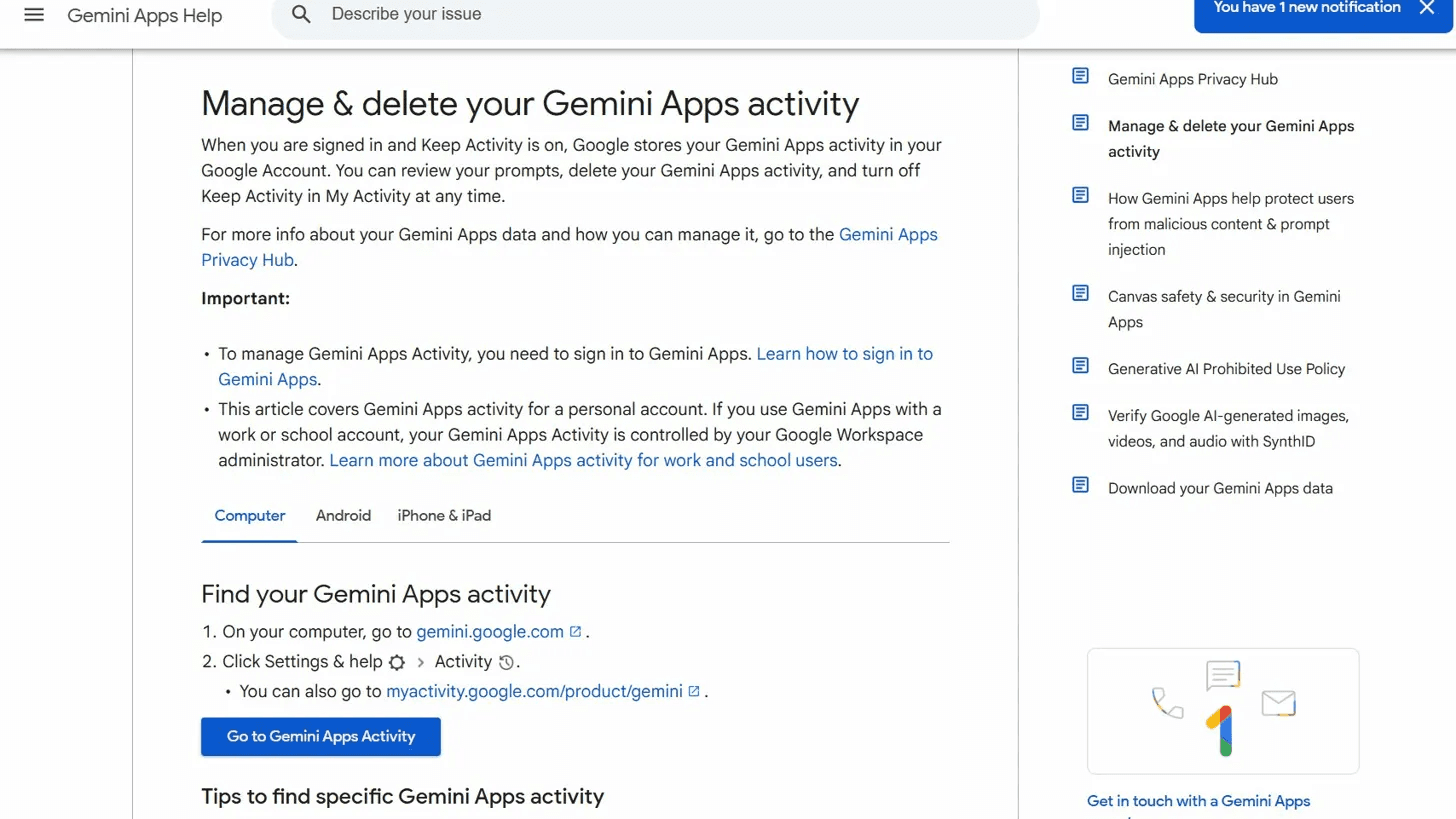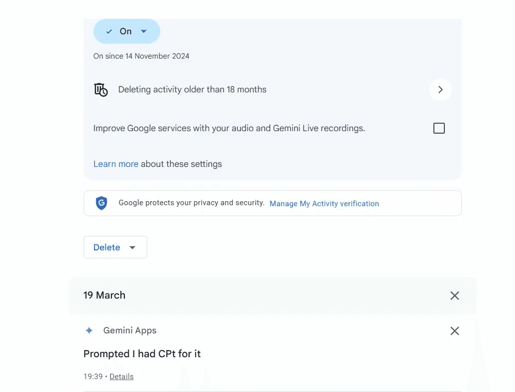 Gemini Apps Activity is the full log of your conversations — separate from Personal context, and equally important to manage.